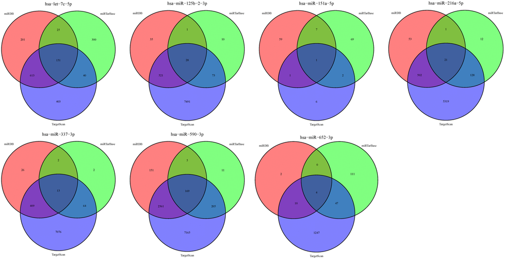 Online analysis tools, miRDB (http://www.mirdb.org/miRDB/index.html), miRTarBase, and TargetScan (http://www.targetscan.org/), were employed to predict the mRNAs that are downstream targets of our signature miRNAs. Owing to the large number of genes mined along with the three algorithms that determined different target binding, the ‘Draw Venn Diagram’ (http://bioinformatics.psb.ugent.be/webtools/Venn/) tool was used to screen the overlapping mRNAs, which were subsequently analyzed via the “enrichplot” package in the R language to annotate GO and enrich the KEGG pathway. The protein-protein interaction (PPI) network analysis of the target genes was conducted via the String Database.