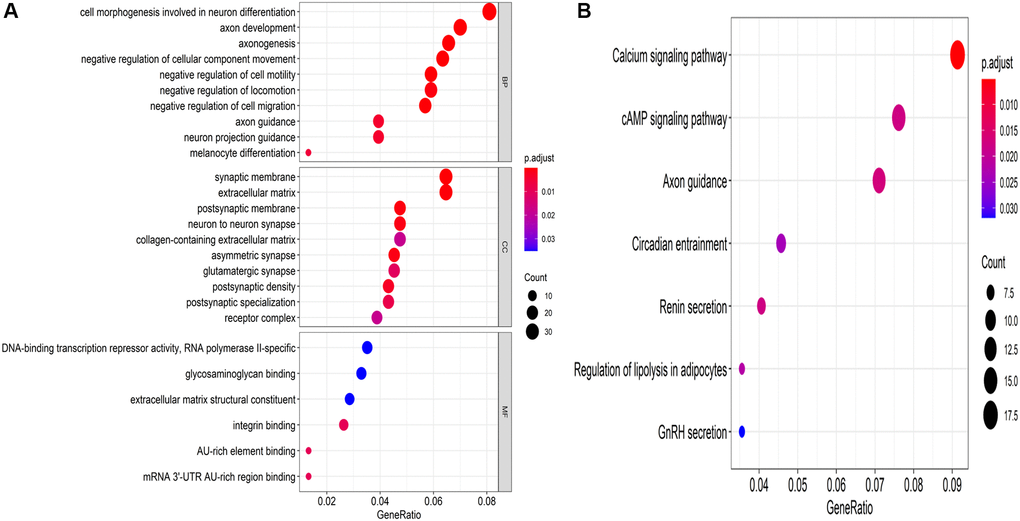 Overall, 387 overlapping mRNAs were identified via three online analysis tools (Figure 5). GO enrichment analysis indicated that these target genes were mainly enriched in 11 biological processes, 10 cellular components, and 6 molecular functions, among which cell morphogenesis involved in neuron differentiation, axon development, and axonogenesis; synaptic membrane, extracellular matrix, and postsynaptic membrane; and DNA-binding transcription repressor activity, RNA polymerase II-specific, glycosaminoglycan binding, and extracellular matrix structural constituent represented the top three biological processes, respectively (Figure 6A). Moreover, KEGG pathway enrichment analysis was conducted, indicating the following seven pathways were enriched with the target genes: calcium signaling pathway, cAMP signaling pathway, axon guidance, circadian entrainment, renin secretion, regulation of lipolysis in adipocytes, and GnRH secretion (Figure 6B).