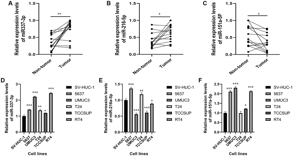 MiR-337-3p, miR-216a-5p, and miR-151a-5p expressions were measured in clinical samples and cell lines using RT-qPCR. As shown in Figure 7A–7C, in the BC tissues, the expression levels of miR-337-3p and miR-216a-5p were significantly increased, while the miR-151a-5p expressions were markedly decreased, comparing with non-tumor tissues. Even miR-216a-5p and miR-151a-5p levels were inconsistent with the results obtained in paired clinical samples; miR-337-3p expression was still significantly upregulated in BC cell lines, indicating that miR-337-3p promotes tumorigenesis (Figure 7D–7F). Thus, owing to its consistently high expressions, we speculate that miR-337-3p promotes the development and progression of bladder cancer.