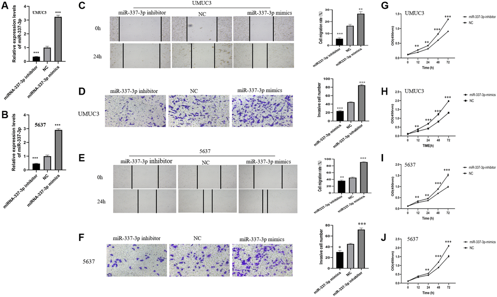 The miR-337-3p mimics, NC, and miR-337-3p inhibitor were transfected into UMUC3 and 5,637 cells. The corresponding upregulated or downregulated miR-337-3p expressions were detected (Figure 8A, 8B). The wound healing assay showed that miR-337-3p overexpression obviously increased the migration rate of UMUC3 and 5637 cells, while opposite results were observed in miR-337-3p inhibitor groups (Figure 8C, 8E). Transwell invasion assays revealed that the group overexpressing miR-337-3p showed increased cell invasion, while the groups transfected with miR-337-3p inhibitor did not (Figure 8D, 8F). In addition, as demonstrated in Figure 8G–8J, the CCK-8 assay reduced cell proliferation in UMUC3- and 5637- cells transfected with miR337-3p inhibitor, while cells transfected with miR-337-3p mimics showed increased cell proliferation. In conclusion, overexpression of miR-337-3p enhances the proliferation, migration, and invasion abilities of BC cells.