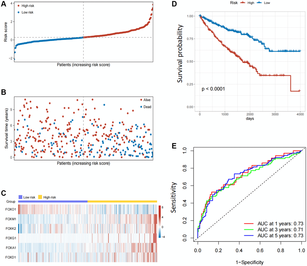 LASSO regression analysis was conducted to screen for FOX family genes that were significantly associated with KIRC patient prognosis. Minimum partial likelihood deviance was used to determine the optimal lambda value. The model was trained using 10-fold cross-validation in the training cohort (Figure 1C, 1D). As a result, we developed a prognostic model based on six FOX family genes namely, FOXO1, FOXM1, FOXK2, FOXG1, FOXA1, and FOXD1. Multivariate Cox proportional hazards regression analysis was used to calculate the Cox coefficients for the six FOX family genes. Risk scores were calculated based on the coefficients and expression levels of six FOX family genes: risk score = (−0.5478 × FOXO1) + (0.4943 × FOXM1) + (0.3012 × FOXK2) + (0.3691 × FOXG1) + (0.6456 × FOXA1) + (0.066 × FOXD1). In the training cohort, each patient's risk score was calculated. The patients were divided into high- and low-risk groups based on their median risk scores (Figure 2A). Figure 2B depicts the patients’ survival status and survival duration in the high-risk and low-risk groups. The expression profiles of the six FOX family genes in the training cohort are shown in Figure 2C. There was a lower mortality rate and better survival among patients in the low-risk group (Figure 2D). To evaluate the accuracy of this prognostic model, ROC curves for 1-, 3-, and 5-year OS were constructed. The AUC values of this model for predicting 1-, 3-, and 5-year OS were 0.73, 0.71, and 0.73, respectively (Figure 2E).