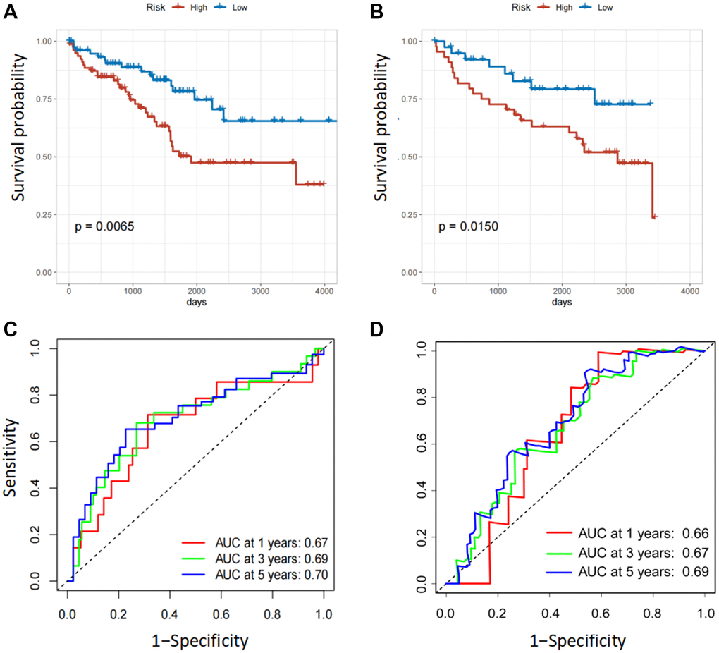 In the internal and external testing cohorts, the same algorithm was used to calculate the patients' risk scores and divide them into high- and low-risk groups (Figure 3A, 3B). The survival rate was lower in high-risk groups (Figure 3C, 3D). The expression profiles of six FOX family genes in the internal and external testing cohorts indicated that FOXM1, FOXK2, FOXG1, FOXA1 and FOXD1exhibited higher expression in the high-risk group (Figure 3E, 3F). Patients in the low-risk group had better OS than those in the high-risk group, based on Kaplan-Meier curves (Figure 4A, 4B). The AUC values of this model for the prediction of 1-, 3-, and 5-year OS were 0.67, 0.69, and 0.70, respectively, in the internal test cohort, and 0.66, 0.67, and 0.69 in the external test cohort (Figure 4C, 4D).