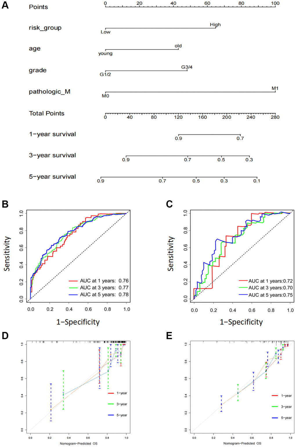 To further improve the accuracy of prognostic predictions, univariate and multivariate Cox regression analyses were performed to analyze other potential variables in addition to risk scores, namely age, sex, grade, T stage, M stage, and clinical stage. The results indicated that the risk scores, age, grade, and M stage were independent prognostic factors for patients (Table 1). Subsequently, we developed a prognostic nomogram to predict OS in patients with KIRC. Risk scores, age, grade, and M stage were integrated into the nomogram (Figure 5A). The AUC values of this model for the prediction of 1-, 3-, and 5-year OS were 0.76, 0.77, and 0.78, respectively, in the TCGA cohort and 0.71, 0.70, and 0.75 in the ICGC cohort (Figure 5B, 5C). The calibration plots indicated that this model had good agreement between the prediction and real-life survival (Figure 5D, 5E).