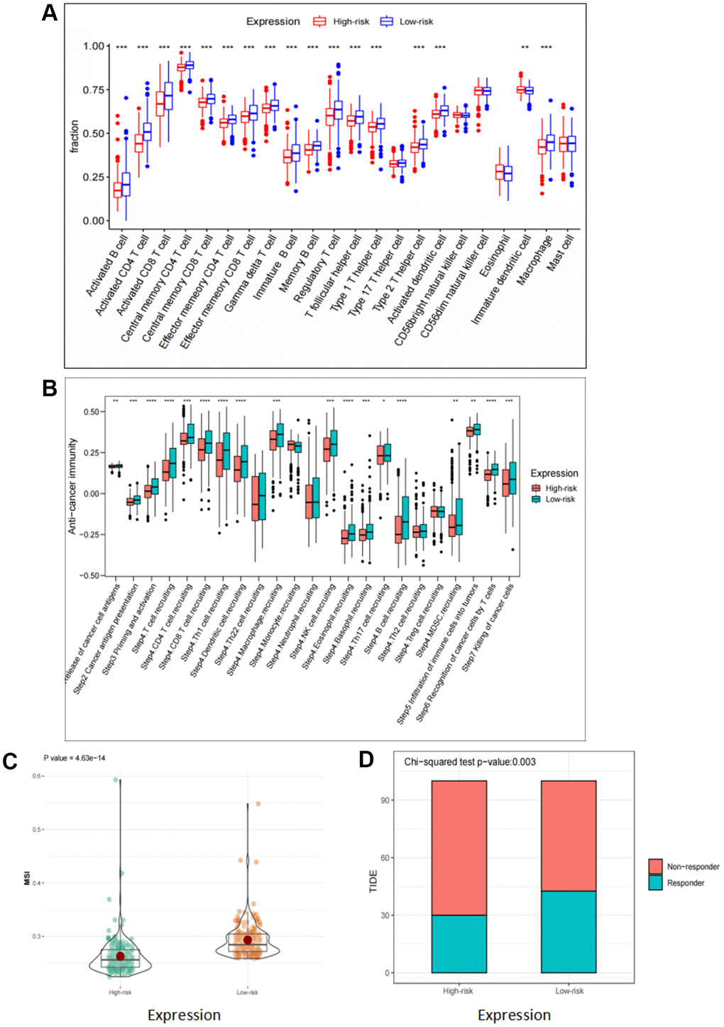 Tumor immune dysfunction and exclusion (TIDE) scores are often used to predict patient response to immunotherapy. A higher TIDE score indicates that the tumor may be able to evade the immune system, while microsatellite instability (MSI) scores are positively correlated with immune response. The scores for TIDE and MSI were calculated online as previously described [14, 15].