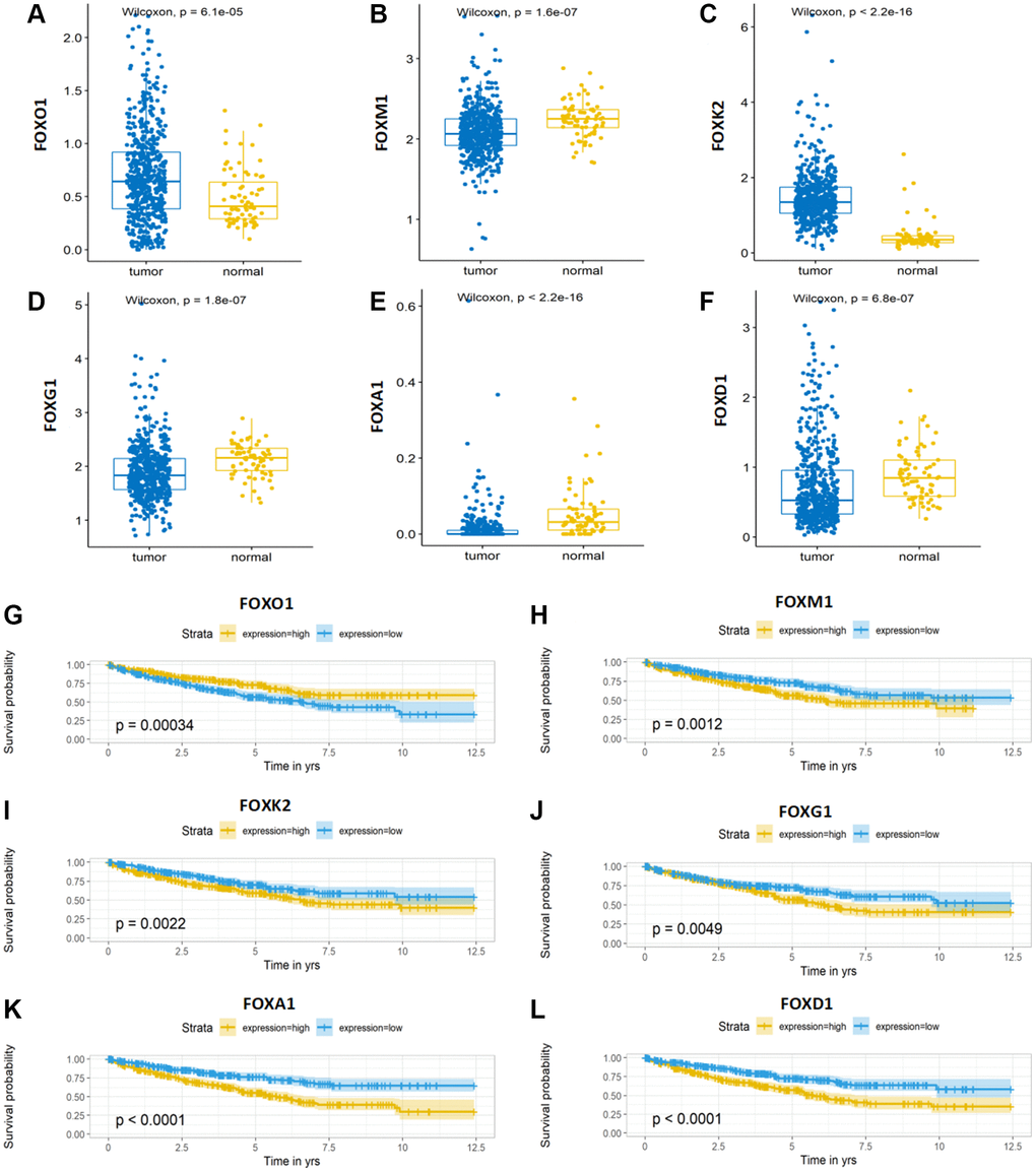 Expression and Kaplan-Meier survival analysis of the six FOX family genes