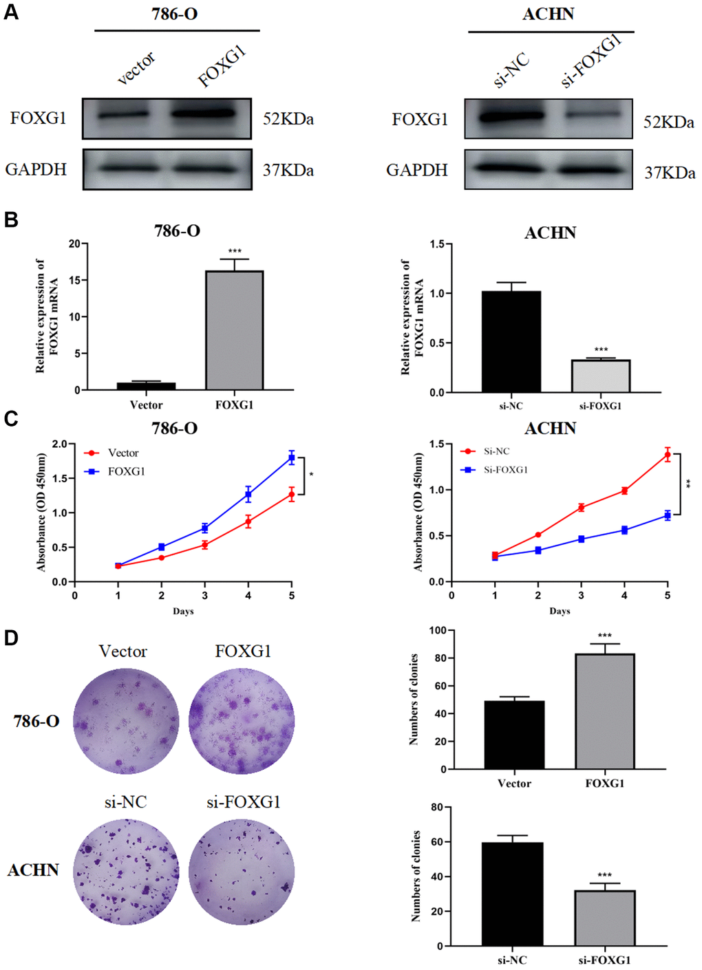 Through a literature search, we found that, except for FOXG1, the remaining five genes have been experimentally studied in RCC. In this research, a total of 82 surgically resected tumor tissues and matched normal kidney tissues from ccRCC patient were collected. The results showed that FOXG1 protein and mRNA levels were higher in tumor tissues than matched adjacent normal tissues. (Supplementary Figure 1A, 1B). Previous studies have indicated the oncogene role of FOXG1 in multiple invasive cancers such as glioblastoma, cutaneous squamous cell carcinoma, and cervical cancer [18–20]. However, the role of FOXG1 in KIRC remains to be elucidated. First, FOXG1 expression was upregulated in 786-O cells using a FOXG1-overexpression plasmid, whereas FOXG1 was silenced in ACHN cells using specific siRNAs. As shown in Figure 8A, 8B, western blotting and qRT-PCR analyses were performed to verify transfection efficiency.
