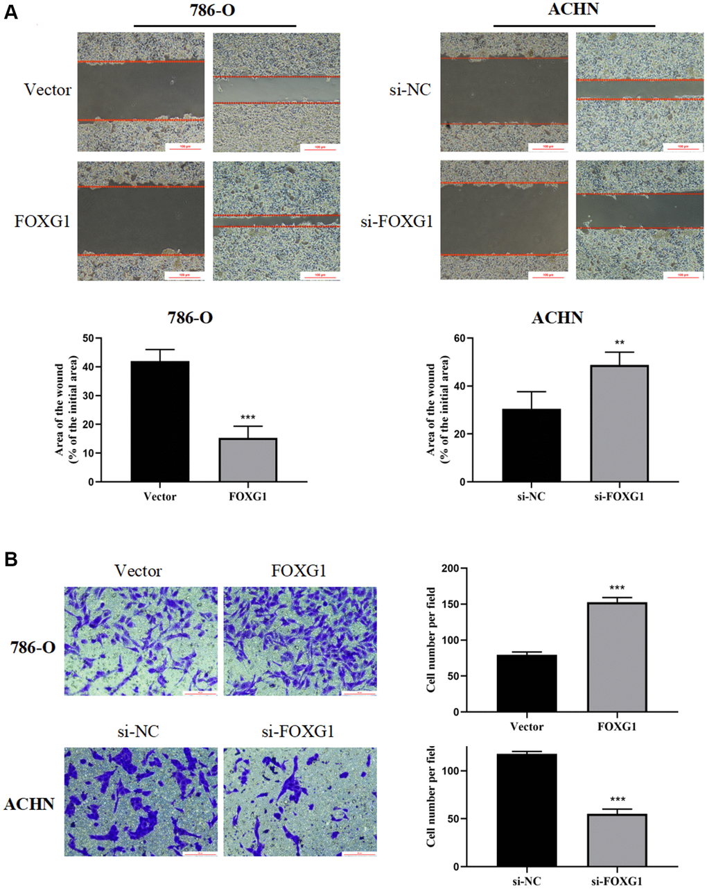 Next, we investigated whether FOXG1 influences the migration and invasion of RCC cells. The wound-healing assay showed that overexpression of FOXG1 enhanced the migration ability of 786-O cells. However, the downregulation of FOXG1 inhibited the migration of ACHN cells (Figure 9A). Concordant with these results, the transwell invasion assay also revealed that knockdown of FOXH1 impaired the invasive properties of ACHN cells, whereas FOXG1 overexpression promoted the invasive ability of 786-O cells (Figure 9B). Taken together, these data illustrate that FOXG1 enhances the migration and invasion of RCC cells.