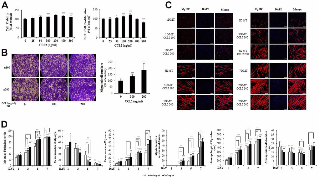Next, we examined MTs differentiation parameters with CCL2 in immunocytochemistry staining (ICC) data. We set 640 x 540 um2 as one field and analyzed 6 to 8 fields for each condition. If there was one nucleus, a cell was considered a myocyte, and two nuclei, a myotube. The fusion index increased with CCL2 exposure compared to 5day CCL2 vehicle only (27.0 % increase, P<0.05). MTs length also increased significantly compared to 5day CCL2 vehicle only (13.1 % increase, P<0.0001) from day 1 to day 7. The number of MTs and the number of mature MTs with three or more nuclei increased in the same pattern. Also, as MTs fusion progressed from day 1 to day 7 of differentiation, the number of myocytes gradually decreased. MTs elongation increased significantly, but MTs width did not show a distinct difference through day 5 (Figure 1D). Collectively, these data indicate that CCL2 contributes to myogenesis by stimulating viability, proliferation, migration, and differentiation.