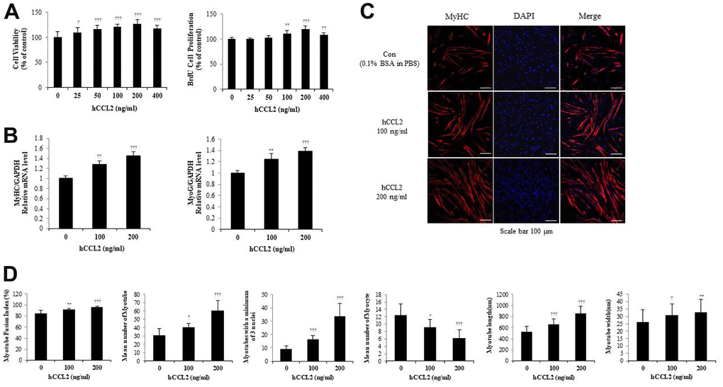 Next, MTs were stained with MyHC antibody, and the nuclei were counterstained with DAPI. MTs lengthened as hCCL2 concentration increased, allowing us to presume that MTs differentiation was progressing (Figure 2C). We examined MTs differentiation parameters with hCCL2 in ICC data. The fusion index increased with hCCL2 exposure compared to hCCL2 vehicle only (14.2 % increase, P<0.0001). MTs length increased significantly compared to hCCL2 vehicle only (65.3 % increase, P<0.0001). The number of MTs and the number of mature MTs with three or more nuclei increased in the same pattern (97.7 % increase, P<0.0001 and 277.5% increase, P<0.0001, respectively). As MTs fusion progressed, the number of myocytes gradually decreased (49.2 % decrease, P<0.0001). Also, MTs width increased significantly (6.9 % decrease, P<0.005) (Figure 2D). These data indicate that hCCL2 contributes to myogenesis by stimulating viability, proliferation, and differentiation.