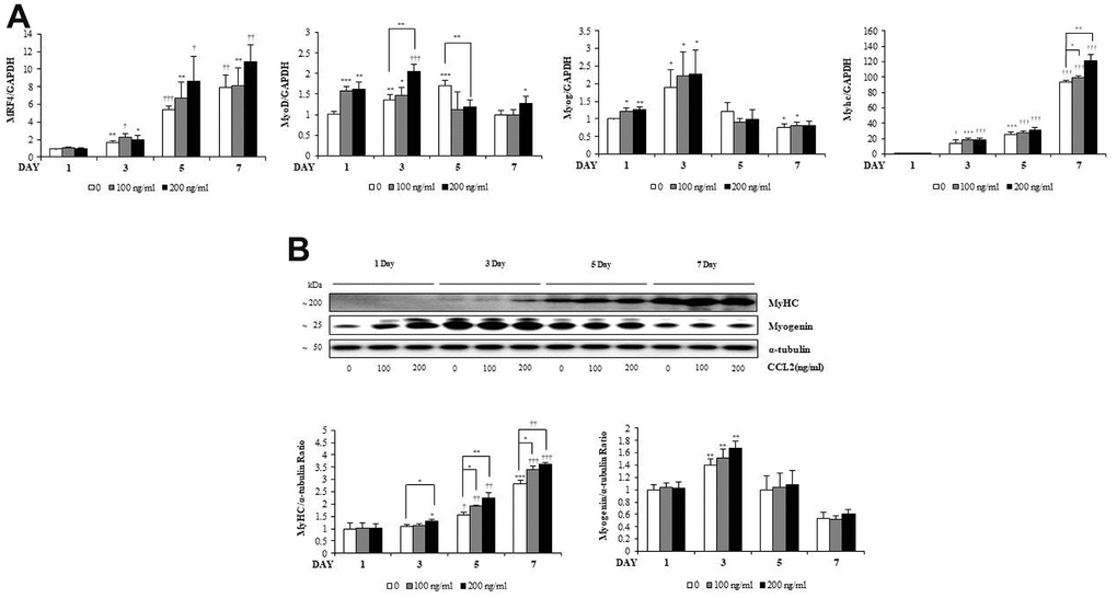 To investigate how CCL2 affects the RNA expression of MTs markers, qRT-PCR was performed. MRF4 tended to increase, dependent on time and CCL2 concentration (Figure 3A). MyoD increased for three days, until the MTs matured, and then decreased after that. Myogenin increased for three days and decreased after five days. These findings can be visualized because the number of committed myocytes also decreased from day 5. MyHC, a late-stage marker of fusion that reflects the change from committed myocytes to mature MTs, increased in a differentiation-day- and CCL2 concentration–dependent manner compared to 7day CCL2 vehicle only (22.8 % increase, P<0.005) (Figure 3A). Western blot analyses of myogenin and MyHC show that same pattern (Figure 3B). To determine protein synthesis activity during myogenesis after CCL2 treatment, the SUnSET assay was performed. Western blot analysis to quantify relative puromycin incorporation by CCL2 showed that CCL2 increased protein synthesis during myogenesis compared to 3day CCL2 vehicle only (13.4 % increase, P<0.05) (Supplementary Figure 2). All data regarding the RNA expression of transcription factors during MTs differentiation indicated that CCL2 enhances MTs formation, differentiation, and fusion.