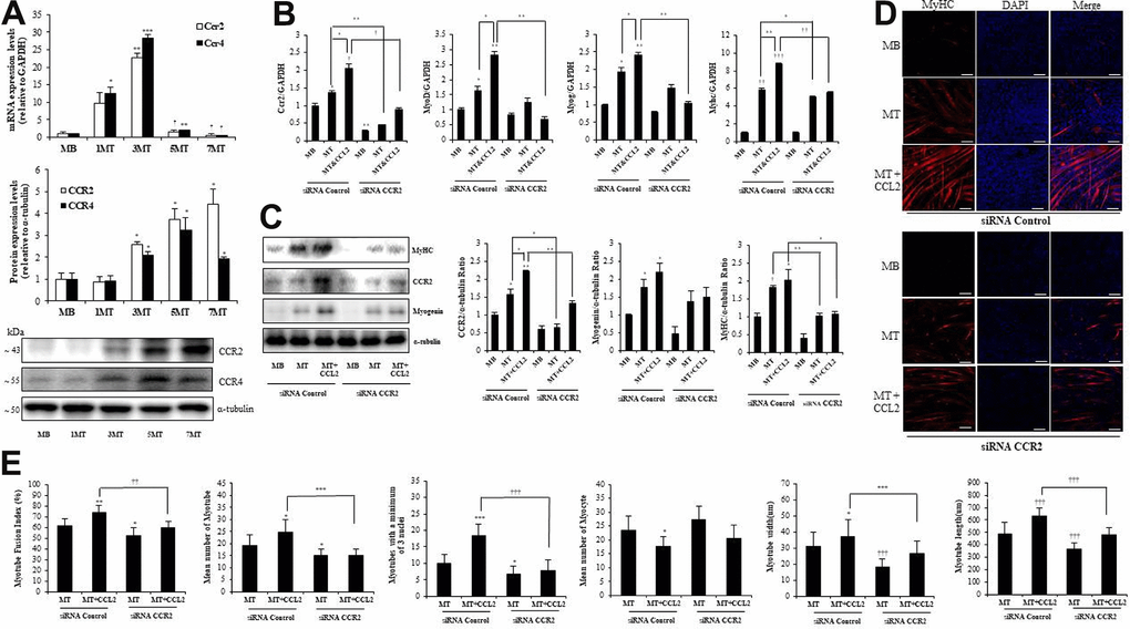 C2C12 MB cells (1.5×105 cells/well) were seeded into 6-well plates for 24 h. CCR2 siRNA oligonucleotides (NM_009915.2), CCR4 siRNA oligonucleotides (NM_009916.2), and negative control siRNA oligonucleotides were synthesized by Bioneer Corp. AccuTarget™ negative control siRNA (SN-1001) was also purchased from Bioneer (Daejeon, Korea). siRNA oligonucleotides were transfected into C2C12 cells using Lipofectamine 3000 (Invitrogen, Waltham, MA, USA) as advised by the manufacturer’s protocol. The siRNA concentration used was 100nM. Briefly, each siRNA and lipofectamine 3000 (Invitrogen) was diluted in serum-free OPTI-MEM and incubated for 5 min, respectively. The diluted siRNA and lipofectamine 3000 reagent were mixed by inverting and incubated for 20 min to form complexes. Pre-formed complexes were added directly to the cells and cells were incubated for an additional 6 h. Then, culture medium was replaced with antibiotic and 10% FBS-containing DMEM and incubated. The next day, differentiation media and CCL2 200 ng/ml were administered together. We used MTs from day 3 of differentiation for our experiments.