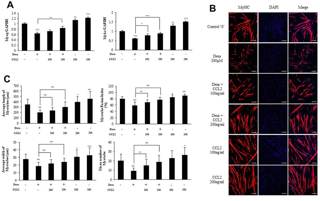 To confirm the importance of CCL2 in protection against myotube atrophy, we induced MTs atrophy with dexamethasone [19, 20] which impairs RNA expression of the transcription factors needed for MTs differentiation. We found that CCL2 restored the damage to MTs caused by dexamethasone (21.8 % increase, P<0.0001) (Figure 5A). The ICC data also show that MTs differentiation was impaired by dexamethasone, and that CCL2 restored myotube atrophy (Figure 5B, 5C). Treating MTs with CCL2 significantly reversed dexamethasone-mediated MTs atrophy.