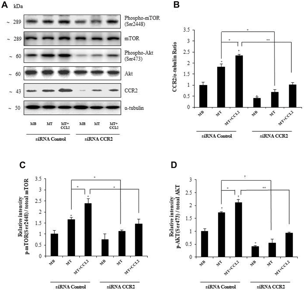 To determine the mechanism by which CCL2 affects myogenesis, we focused on the AKT-mTOR signaling pathways, which are related to protein synthesis in myogenesis [21]. Western blot analyses revealed that CCR2 expression increased with CCL2 administration and decreased with CCR2-siRNA exposure (Figure 6A, 6B, respectively). The activity of p-mTOR/mTOR and p-AKT/total AKT also increased with CCL2 compared to CCL2 vehicle only (18.3 and 30.5% increase respectively, P<0.05) and decreased with CCR2-siRNA compared to CCL2 (38.9 % (P<0.05) and 56.7% (P<0.005) reduction respectively) (Figure 6C, 6D, respectively). These results indicate that AKT-mTOR is a crucial signal regulating the effects of CCL2 on myogenesis. To detect whether the effects of CCL2 promoting myogenesis can be blocked by the inhibitor, we conducted Western blot analyses with AKT-mTOR inhibitor (Supplementary Figure 3A). The activity of p-mTOR/mTOR and p-AKT/total AKT decreased with Akt inhibitor compared to CCL2 (56.2% (P<0.005) and 94.3% (P<0.005) reduction respectively) (Supplementary Figure 3B). And also, the relative intensity of MyHC and myogenin decreased with Akt inhibitor compared to CCL2 (60.5% (P<0.05) and 67.8% (P<0.01) reduction, respectively) (Supplementary Figure 3C).