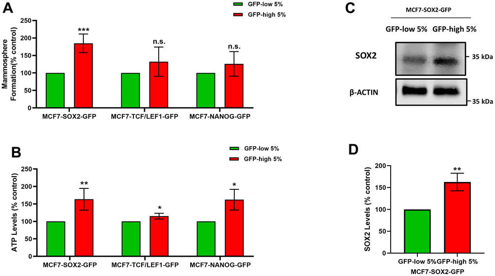 Here, we showed that SOX2-high MCF7 cells have a significant increase in their mammosphere forming ability, as well as in ATP production, indicating that this sub-population is functionally enriched in CSC activity. NANOG-high MCF7 cells and TCF/LEF1-high MCF7 cells also showed greater mammosphere forming ability and ATP production. However, the differences compared with GFP-low cells were not as significant. As such, we chose to focus on SOX2, as the reporter of choice for isolating the CSC sub-population.