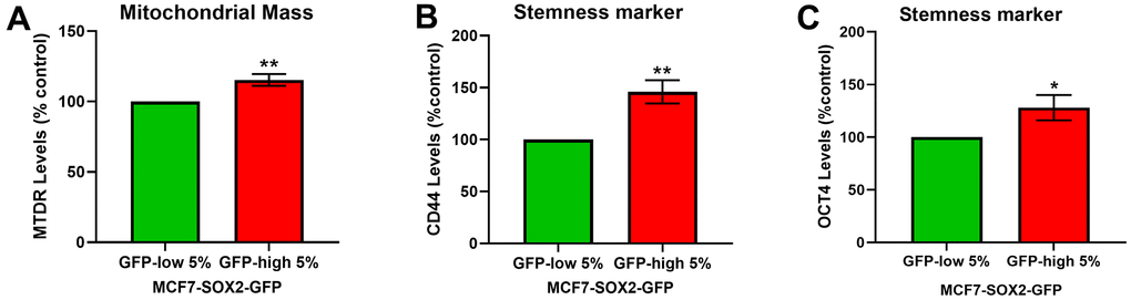To further validate the phenotype of SOX2-high MCF7 cells, we used a well-established fluorescent probe to quantitate mitochondrial mass, namely MitoTracker Deep-Red (Figure 2A), and two stemness markers, CD44 (Figure 2B) and OCT4 (Figure 2C), by FACs analysis. FACS quantitation of median fluorescence intensity (MFI) shows that both measures are significantly elevated in SOX2-high MCF7 cells.