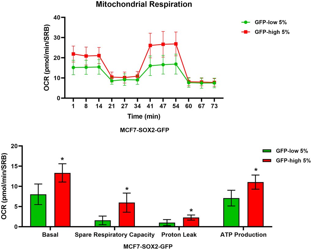 Similarly, metabolic flux analysis was conducted using the Seahorse XFe96 to quantitatively measure oxidative mitochondrial and glycolytic activity. We observed a significant increase in both mitochondrial function and glycolysis in SOX2-high MCF7 cells. Furthermore, SOX2-high MCF7 cells were more proliferative, showing increases in the S-phase and the G2/M-phase of the cell cycle, confirming the presence of a proliferative and energetic CSC phenotype, with increased mitochondrial ATP production [1].