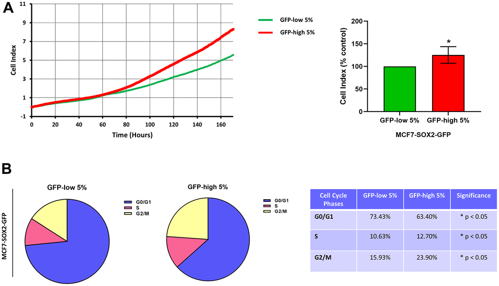 Finally, the SOX2-high cells were more proliferative than the SOX2-low cells (Figure 5A). Similarly, we observed by cell cycle analysis (Figure 5B) that SOX2-high cells showed a significant decrease in the G0/G1-phase, with corresponding increases in S-phase and G2/M-phase.