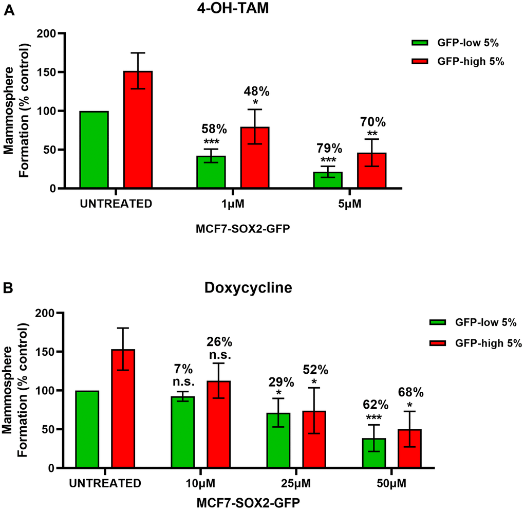 We also evaluated the effect of Doxycycline (Figure 6B), an FDA-approved antibiotic which inhibits mitochondrial biogenesis [10], on the mammosphere formation of SOX2-high and SOX2-low MCF7 cell sub-populations. Note that SOX2-high cells were more sensitive to Doxycycline treatment, resulting in a reduction by 26% at 10μM, by 52% at 25μM and by 68% at 50μM, as compared with vehicle-treated control SOX2-high cells. SOX2-low cells show a mammosphere reduction by 7% at 10μM, by 29% at 25μM and by 62% at 50μM, as compared with vehicle-treated control SOX2-low cells. Therefore, SOX2-high cells were more effectively targeted by Doxycycline.