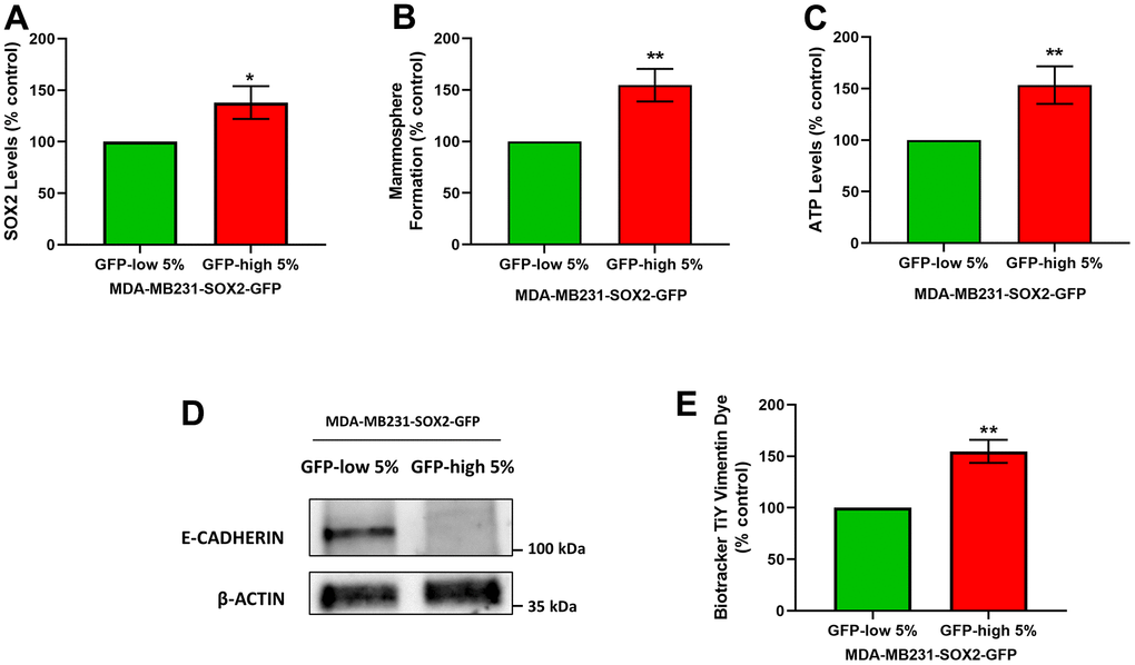 CSCs have also been implicated in cell motility and invasiveness, resulting clinically in metastatic dissemination. To study this process further, we used MDA-MB-231 cells, a well-established model for the study of cell motility, invasion, and metastasis. SOX2-high MDA-MB-231 cells have higher expression levels of SOX2 protein, as compared with SOX2-low MDA-MB-231 cells, directly validating the model. Remarkably, SOX2-high MDA-MB-231 cells showed increases in their capacity to undergo both cell migration and invasion. To further validate this phenotype, we examined the expression of EMT markers in these cell populations, as EMT activation is necessary for the dissemination of the cancer cells to distant tissues [23]. Also, we examined their ability to undergo anchorage-independent growth (mammosphere assay) and their energetic status (ATP levels), confirming that SOX2-high MDA-MB 231 cells possess a stem-like and hyper-energetic phenotype.
