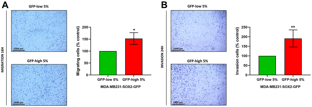 Finally, migration and invasion experiments performed with Transwells directly demonstrated that SOX2-high MDA-MB-231 cells indeed were more migratory (Figure 8A) and invasive (Figure 8B), since the number of cells that had crossed the membrane were greater. Taken together, these results show that SOX2-high MDA-MB-231 cells show a more aggressive, motile and invasive phenotype, consistent with increased stemness.