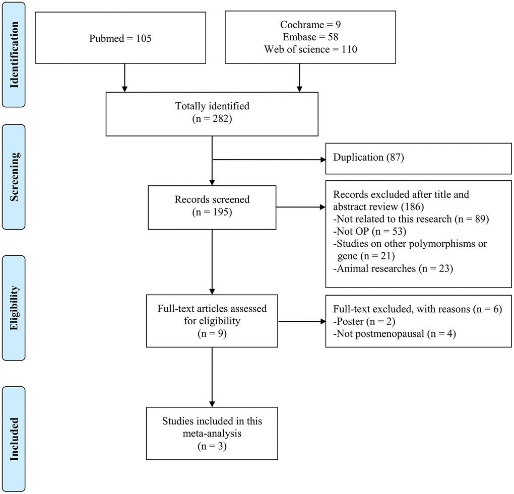 Flowchart is shown in Figure 1. A total of 282 papers were in this meta-analysis, including 105 papers from PubMed, 58 papers from Embase, 9 papers from Cochrane, and 110 papers from Web of Science. Criteria of exclusion contained repetition, 87 papers; unrelated-genes or -OP topics, 74 papers; animal studies, 23 papers; posters, 2 papers; or non-postmenopausal women, 4 papers. Finally, there were 3 papers in this meta-analysis (Supplementary Table 3) [14–16]. Assessment of methodological quality was evaluated according to Newcastle–Ottawa Scale, and all criteria of scores were set as ≥7 points (Supplementary Table 4).
