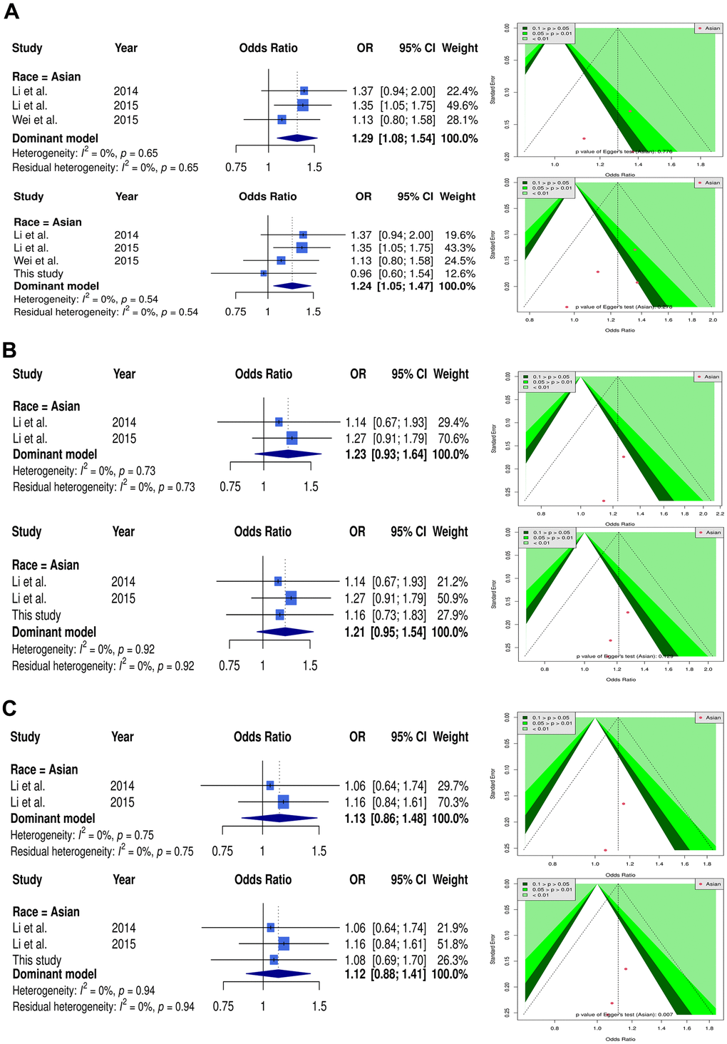 Forest plot presents rs35767 in dominant model of meta-analysis and merged case-control study, showing [OR: 1.29 (95% CI: 1.08–1.54)] and [OR: 1.24 (95% CI: 1.05–1.47)], respectively. We adopted a funnel plot to examine the publication bias. None significant result of asymmetry was observed (p = 0.261) (Figure 2A). We also evaluated the meta-analysis results for rs2288377 and rs5742612, but there was no significant difference in the results (Figure 2B, 2C).