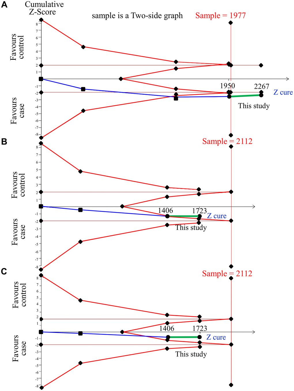 Multiple tests in meta-analyses will result in p-value inflation and cause the study results to be significantly more easily, thereby increasing the probability of type I error occurring. TSA compares the confidence intervals of past meta-analyses and can better control type I and II errors [42]. The TSA results of this study showed that this study is a crucial sample, and a decisive conclusion is obtained from sufficient accumulated samples in rs35767.