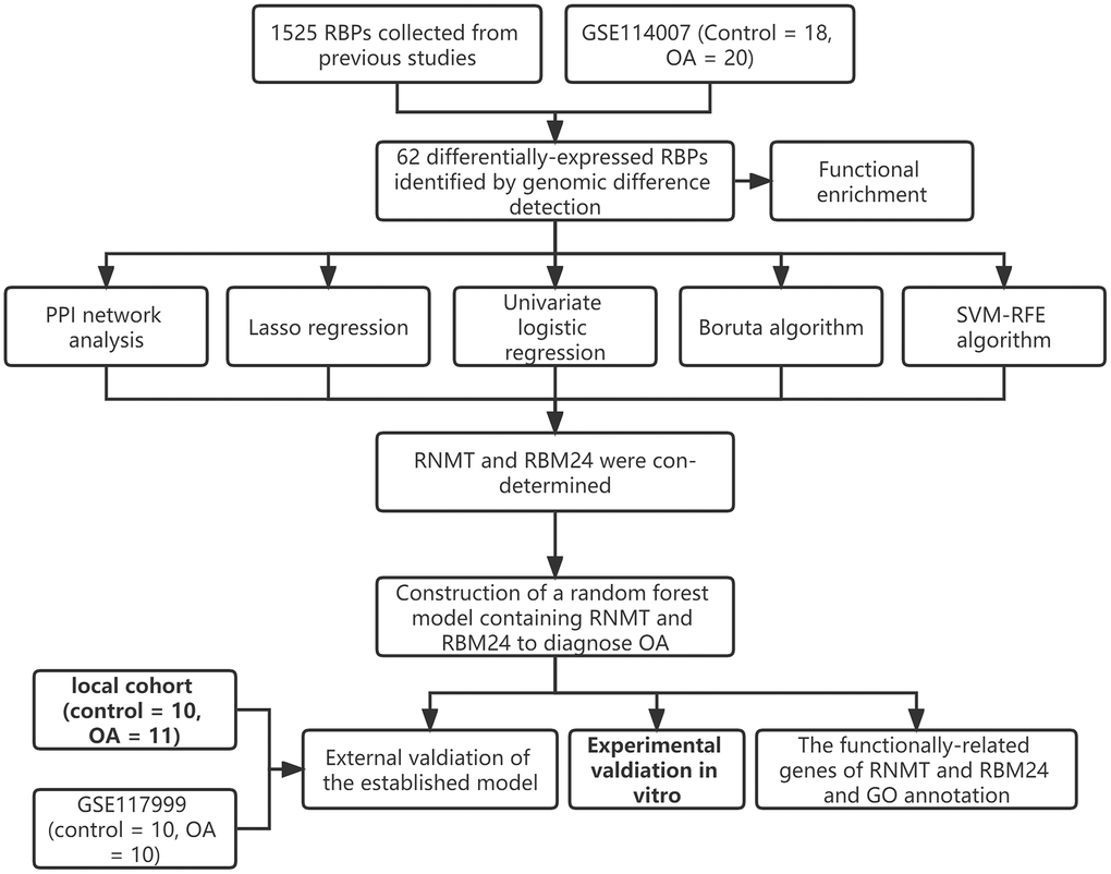 Herein, the present study collected 1525 RBPs from previous reports and detected their expression levels in the knee cartilage tissue isolated from control and OA subjects. A sum of 62 differentially-expressed RBPs were identified, RNMT and RBM24 of which were determined as the significant biomarkers for OA through multiple machine learning algorithms and bioinformatical analyses. To achieve better predictive performance, we constructed an RF model using the expression values of RNMT and RBM24. Importantly, the RF model has been externally validated in another public dataset and the clinical samples collected from the local hospital. Besides, the in vitro OA model was constructed in CHON-001 cells, which were treated with IL-1β to mimic OA. The RNA and protein levels of RNMT and RBM24 significantly decreased in the OA model group, suggesting RNMT and RBM24 might be important regulators in the development of OA.