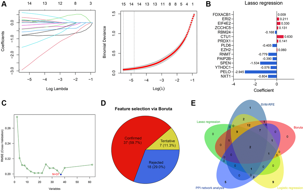 To identify the genes significantly associated with OA, we implemented various machine learning algorithms, as previously reported [16]. Lasso regression with 10-fold cross-validation was conducted via the glmnet package. The Boruta algorithm was conducted by the Boruta package, and the features labeled with “Confirmed” were selected. The caret package was used to conduct the SVM-RFE. Last, univariate logistic regression was performed with the rms package, where P < 0.01 was statistically significant.