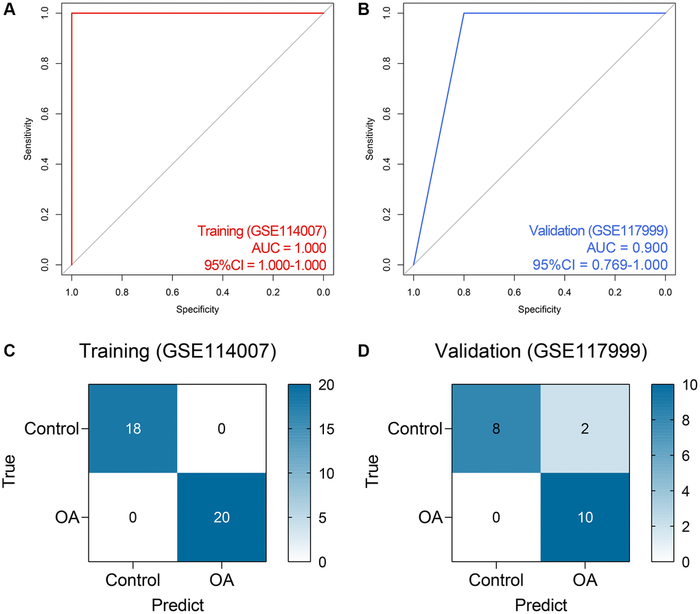 Currently, the diagnosis of OA mainly depends on the clinical presentations and imaging examination, often leading to delayed diagnosis and missing the optimal time to intervene [21]. Therefore, many efforts have been devoted to seeking reliable diagnosis biomarkers in recent years, and some novel molecules as OA diagnosis markers have been reported, such as ATF3 [22], Apolipoprotein D [23], and CXCL13 [24]. The rapid development of genomic sequencing technology and big-data analysis methods represented by machine learning generates new opportunities to disclose novel biomarkers and to develop novel diagnostic tools, and many achievements have been obtained in OA [25–27]. Nevertheless, the reports about OA diagnosis models based on machine algorithms are relatively rare at the moment.