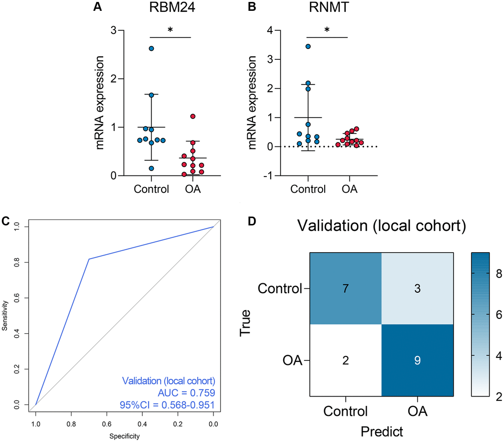 Given the fact that the GSE117999 dataset has not been publicly published, we collected 10 control and 11 OA samples from the local hospital to re-confirm the reliability of the model. The baseline clinicopathological parameters of the training cohort and the local cohort were displayed in Table 3. Since the GSE117999 dataset has not been published, the clinical information of the GSE117999 cohort was unavailable. The gene expression levels of RBM24 and RNMT were measured via RT-qPCR since the predictive model was based on the RNA expression values. The raw CT values of the genes in the clinical samples were exhibited in Supplementary Table 4. Compared with the control samples, RBM24 (P < 0.05, Figure 6A) and RNMT (P < 0.05, Figure 6B) were both down-regulated in the OA samples. The RF model could also diagnose OA in the local cohort to some extent (AUC = 0.759, 95% CI = 0.568–0.951, Figure 6C, 6D showed the corresponding confusion matrix. The RF model exhibited moderate diagnosis performance in the local cohort compared with that in the public datasets, and the different gene expression detection platforms (RT-qPCR vs. high-throughput sequencing) and the relatively small sample size might account for this divergence. Other assessment indexes, including accuracy, precision, recall, F-measure, sensitivity, specificity, positive predictive value, and negative predictive value, of the RF model in each cohort were shown in Table 4.