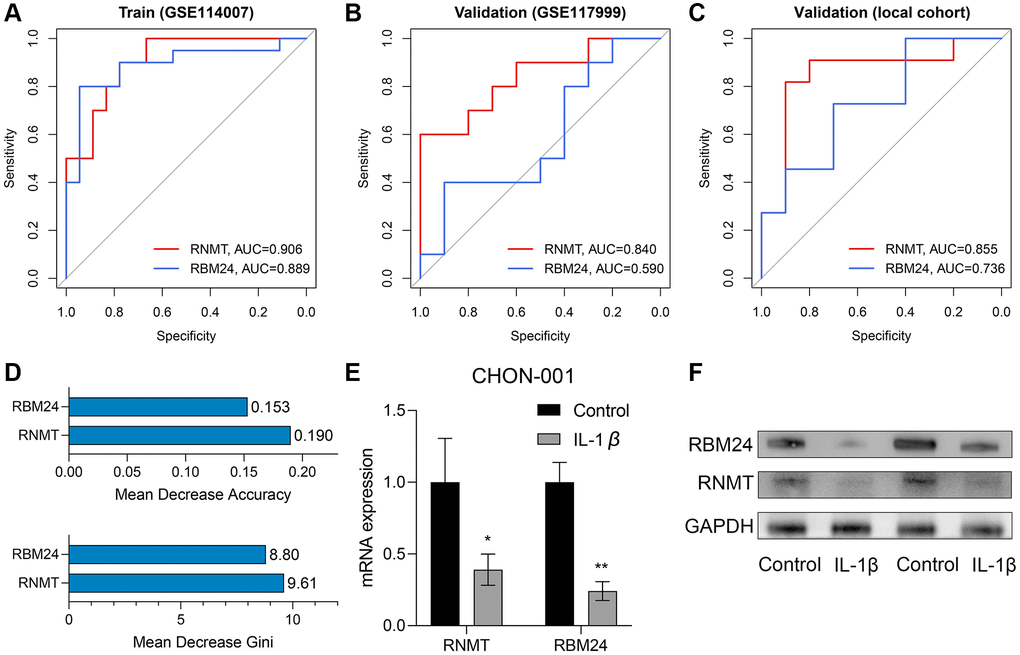 The ROC analyses revealed the predictive ability of RBM24 and RNMT to OA in the training dataset (RNMT, AUC = 0.906; RBM24, AUC = 0.889; Figure 7A), the GSE117999 dataset (RNMT, AUC = 0.840; RBM24, AUC = 0.590; Figure 7B), and the local cohort (RNMT, AUC = 0.855; RBM24, AUC = 0.736; Figure 7C). We observed that except for RBM24 in the GSE117999 cohort, the variables in these cohorts all exhibited high diagnosis values (AUC > 0.7). At the same time, the mean decrease accuracy and mean decrease Gini of RNMT were superior to those of RBM24 (Figure 7D), suggesting that RNMT was a relatively more reliable biomarker than RBM24. At last, we constructed the OA model in vitro and detected the RNA and protein levels of RNMT and RBM24. RT-qPCR and Western Blotting indicated that RNMT (P < 0.05) and RBM24 (P < 0.01) were both down-regulated in the OA model group, as shown in Figure 7E, 7F respectively. This evidence demonstrated that RBM24 and RNMT both serve as critical biomarkers for OA and are associated with OA development.