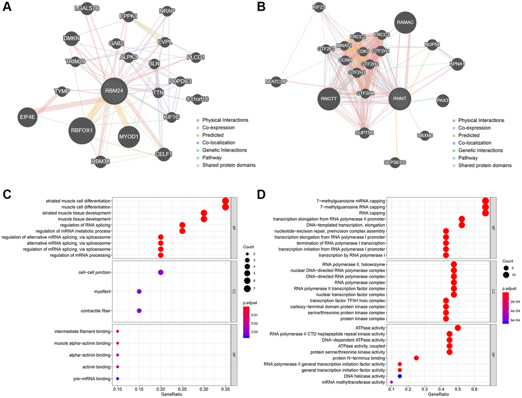 The Top 20 genes most relevant to RBM24 and RNMT were illustrated in Figure 8A and Figure 8B, respectively. Gene Ontology (GO) analysis indicated that RBM24 and its associated genes were mainly enriched in muscle development and differentiation and RNA metabolism, splicing, and processing (Figure 8C), and RNMT and its correlated genes mainly participated in RNA synthesis and modification, ATPase activity, and serine/threonine kinase activity (Figure 8D). These results might provide clues to elucidate the roles RBM24 and RNMT play in OA.