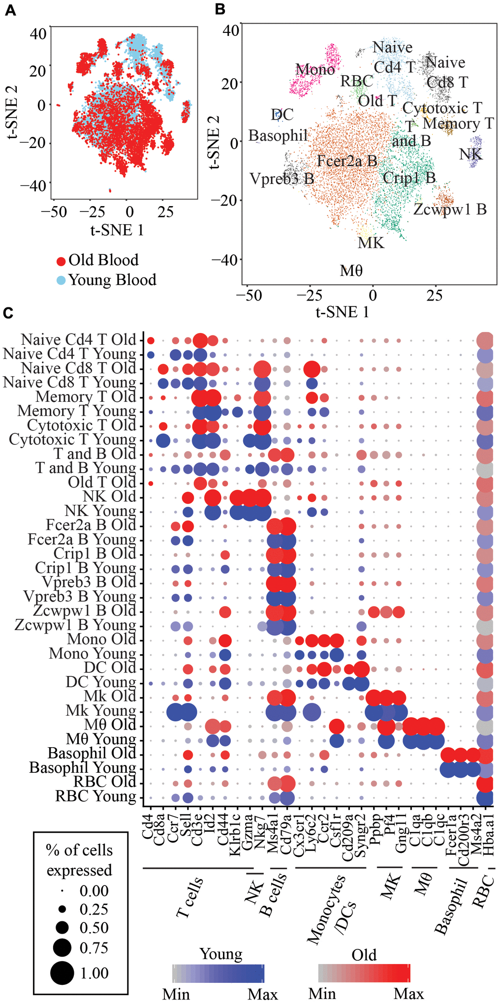 Transcriptional changes with age in specific immune cell types or lymphoblastoid cell lines in humans have been investigated in previous studies [16, 17]. scRNA-seq is a powerful technique that can dissect the transcription profiles of thousands or more cells from the same sample [18]. Other studies have used single-cell RNA-seq on the peripheral blood to identify and reclassify cell types and to investigate the changes in immune function of specific cell types upon stimulation with age in humans and mice, respectively [15, 19, 20]. Here, we profiled 14588 single cells from the mouse blood and assessed the differences between young and old mice.