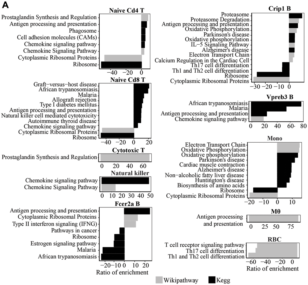 We used Seurat to identify differential gene expression within clusters with age. Only genes expressed in at least 10% of cells in each cluster and age group were analyzed. We observed a general trend of the upregulation of genes involved in “Antigen processing and presentation” and “Chemokine signaling” pathways with age in naïve Cd4 and Cd8 T cells and Vpreb3 B cells. NK cells from old mice also exhibit increased expression of genes in the “Chemokine signaling” pathway (Figure 2A). In addition, we also observed an upregulation of genes in “Antigen processing and presentation” in macrophages, Crip1 B cells, and Fcer2aB cells. Crip1 B cells and monocytes also showed an upregulation of genes in the “Oxidative phosphorylation” pathway. In contrast, we observed a trend of downregulated genes involved in “Cytoplasmic Ribosomal Proteins” and “Ribosome” pathways in several cell types, naïve Cd4 and Cd8 T cells, Crip1 B cells, and monocytes, with age (Figure 2A).