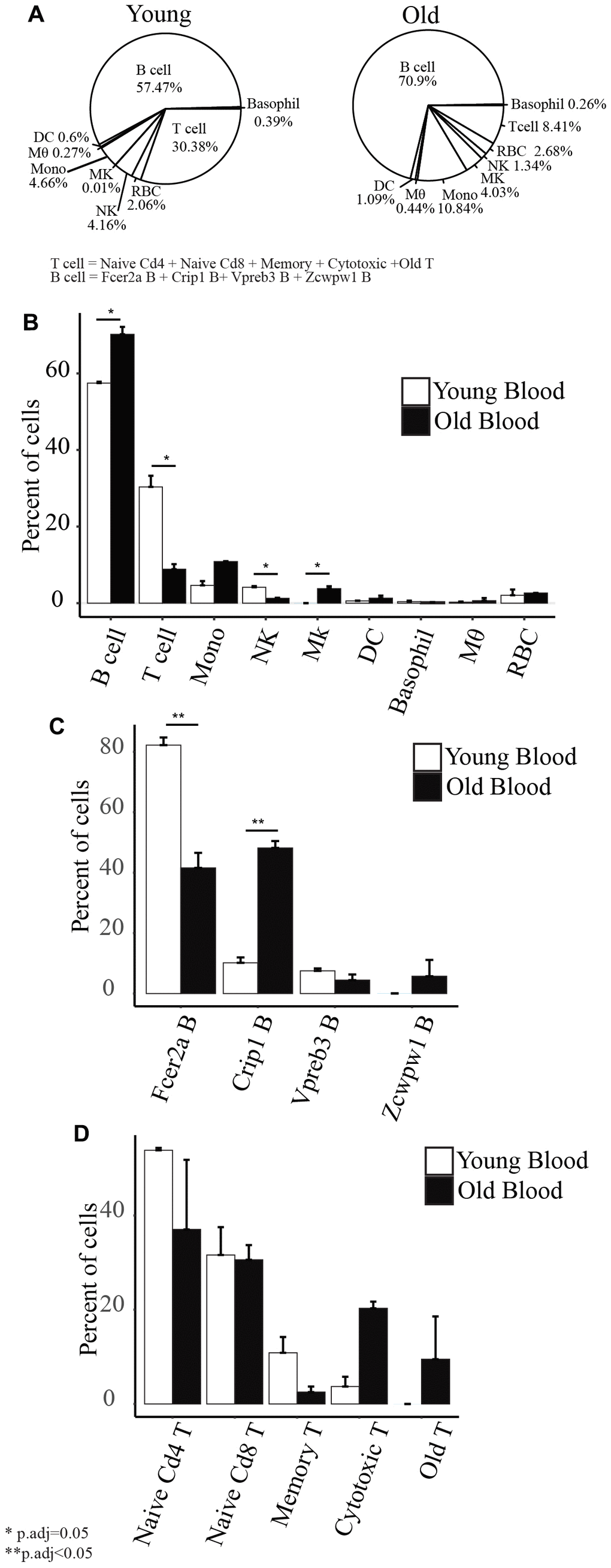 B cells comprised the largest proportion of immune cells isolated from the peripheral blood (57.4% in young mice and 70.9% in old mice) (Figure 3A). In young mice, 30.38% of the isolated cells are T cells, 4.66% are monocytes, 4.16% are NK cells, 0.6% are DC, 0.39% are basophils, 0.27% are macrophages, and 0.01% are Mk cells. In old mice, 8.41% of the cells are T cells, 10.84% are monocytes, 4.03% are Mk cells, 1.34% are NK cells, 1.09% are DC, 0.44% are macrophages, and 0.26% are basophils. Although red blood cell lysis was performed on the samples, we still retrieved 2.06% of RBC from the young mice and 2.68% from old mice. Using the same technique in extracting the cells from young and old mice, we observed a few changes to the composition of cell types with age. First, we detected a significantly lower percentage of T cells and NK cells and higher percentage of B cells and Mk cells in old mice compared to young mice (Figure 3B). Second, within the subsets of B cells, we observed a decrease in the percentage of Fcer2a B cells and increased Crip1 B cells in old mice (Figure 3C). We did not detect any significant changes to the subsets of T cells (Figure 3D).