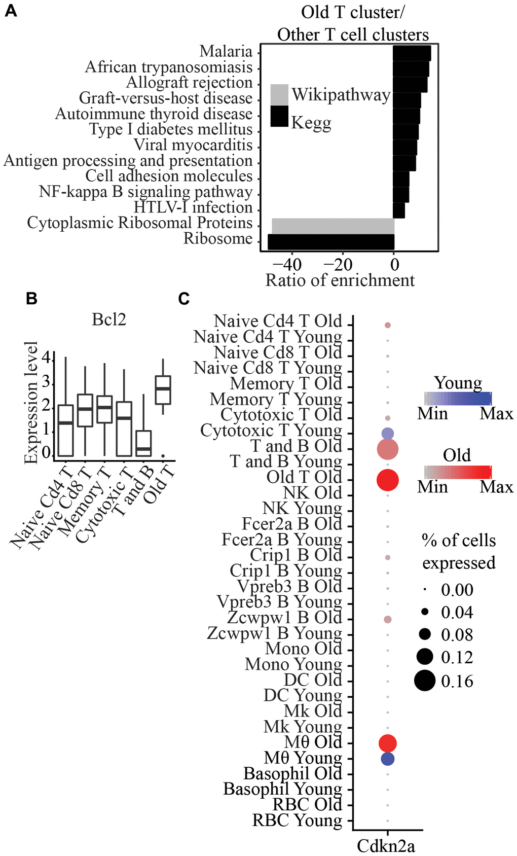 We identified one cluster that consists of only cells from old mice (labeled as “Old T” in Figure 1B), and these cells expressed Cd3e, the marker of T cells. In addition, this cluster also expressed Cd40lg and Tnfsf8 compared to other T cell clusters, suggesting that it consists of activated T cells (Supplementary Figure 2). Pathway analysis of genes significantly upregulated between this cluster and other T cells clusters showed enrichment of “Antigen processing and presentation” and “NF-kappa B signaling pathway” (Figure 4A). In addition, this cluster expressed significantly higher Bcl2 expression (p=3.9x10-15) (Figure 4B) than other T cells clusters. No other pro-apoptotic gene (Bax, Bak1, Bad, Bid, Bik) or anti-apoptotic gene (Bcl2, BclxL, Bcl2l1, Nfkb1, Cflar) was significantly differentially expressed. Notably, it also showed significantly higher expression of Cdkn2a and lower expression of Cd28 than all other clusters (p=5.38x10-40 and p=6.26x10-8, respectively) (Figure 4C and Supplementary Figure 2).