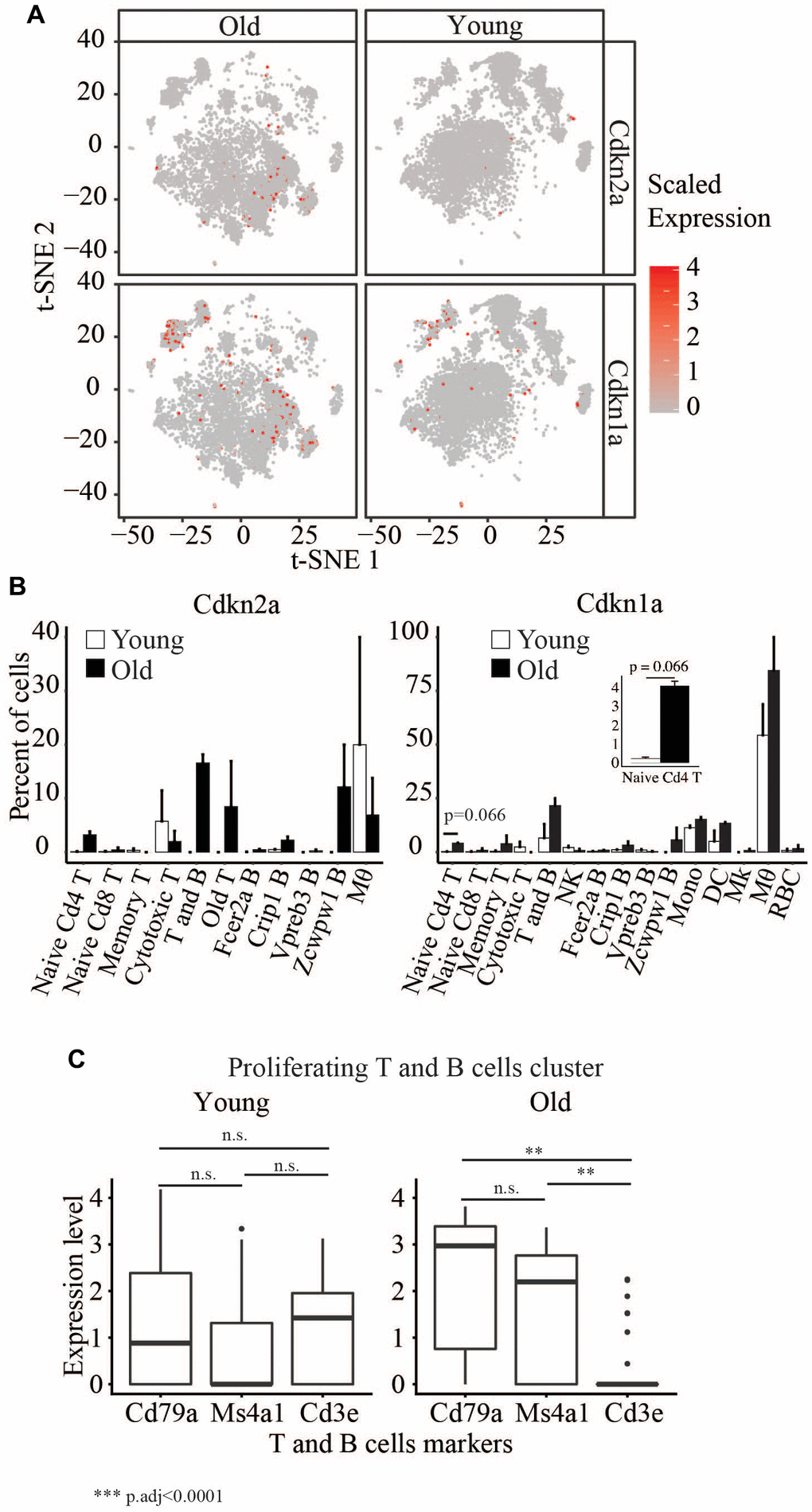 Immunosenescence has been widely implicated in aging. Cellular senescence, an irreversible cell cycle arrest biological process, was first discovered in fibroblast, and senescent cells can be identified by a collection of markers, which include, for example, upregulation of Cdkn1a and Cdkn2a. We observed a significant increase in the percentage of old blood cells (6.3%) expressing Cdkn1a and/or Cdkn2a compared to young cells (Fisher’s Exact Test p<2.2x10-16) (Figure 5A). However, we did not detect any cell type with significant differences in the expression of these two genes between ages. Still, we did observe a moderate (p=0.066) increase in the number of Cdkn1a expressing cells in naïve Cd4 T cells (Figure 5B).