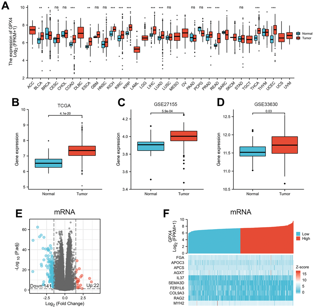 We first evaluated expression of GPX4 mRNA in pancancer data from TCGA. As shown in Figure 1A, the analysis revealed GPX4 expression to be higher in 22 of 33 cancer types (The full names of tumor abbreviation referred to Supplementary Table 1). Interestingly, GPX4 expression was not significantly decreased, except in breast invasive carcinoma. Then, we further validated that GPX4 expression in thyroid cancer tissues was obviously higher than that in normal tissues using TCGA data (Figure 1B, p<0.001). In addition, we confirmed the above results in the GEO database. As expected, GPX4 was highly expressed in thyroid cancer according to the GSE27155 (p=5.9e-04) (Figure 1C) and GSE33630 (p=0.03) (Figure 1D) datasets.