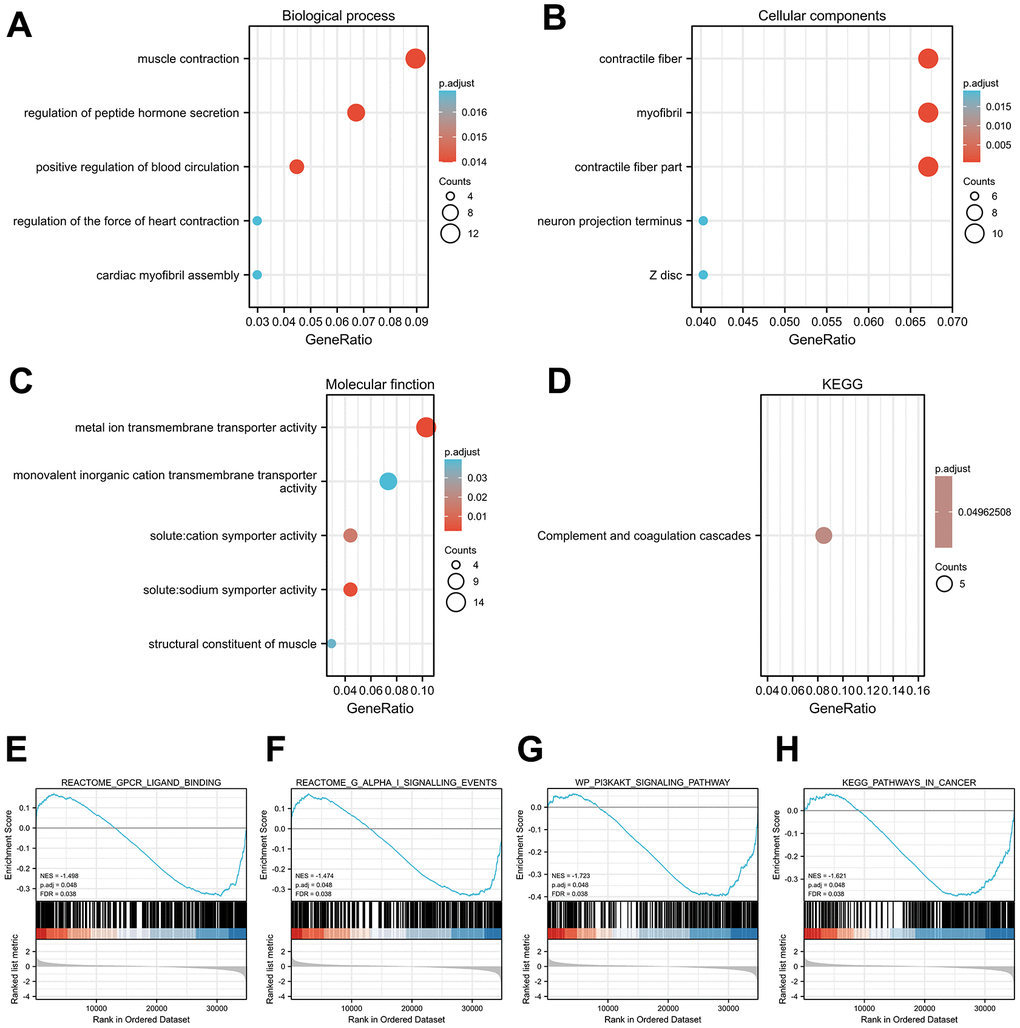 To assess functional enrichment of GPX4-associated DEGs in thyroid cancer patients, relevant DEGs were enriched using GO analyses in biological process (Figure 3A), cellular component (Figure 3B), and molecular function (Figure 3C) by the “clusterProfiler” R package. The DEGs were only enriched in the KEGG pathways of the complement and coagulation cascades (Figure 3D). Reactome and KEGG pathways were searched by using GSEA, which revealed that Gpcr ligand binding (Figure 3E), G alpha I signaling events (Figure 3F), the PI3KAKT signaling pathway (Figure 3G) and pathways in cancer (Figure 3H) were significantly enriched. These results indicate the potential role of GPX4 in the tumorigenesis of thyroid cancer, especially with regard to signaling-related pathways.