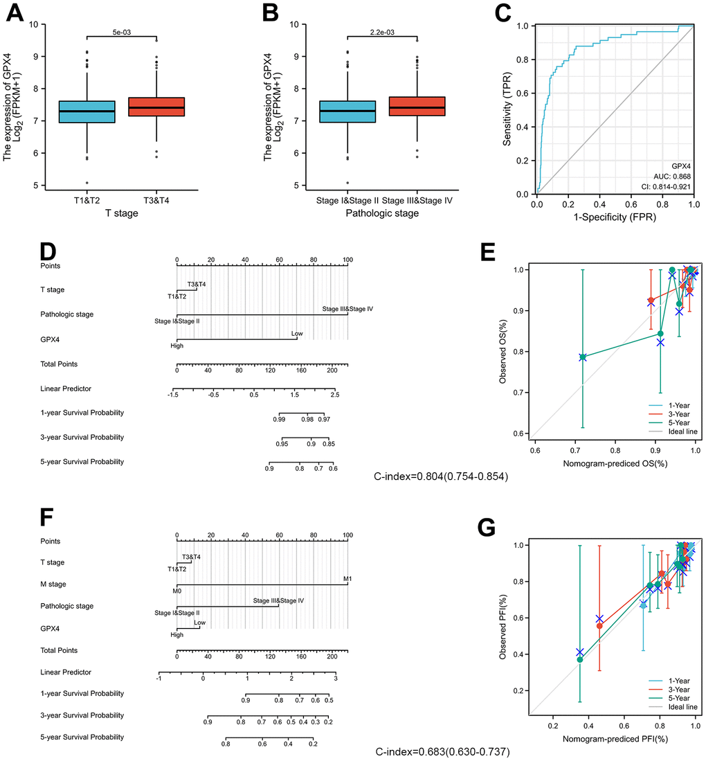 The prognostic factors indicated to be statistically significant were used to establish a prognostic nomogram, and we further generated calibration curves to verify the efficiency of this nomogram. Clinical T stage, pathologic stage, and GPX4 were included to predict overall survival; the C-index of the nomogram was 0.804 (Figure 4D). Clinical T and M stage, pathologic stage and GPX4 were included to predict the progression-free interval; the C-index of the nomogram was 0.683 (Figure 4F). The corresponding calibration curves all showed that the two nomograms had satisfactory predictive ability for clinical outcomes, except that the 5-year prediction for overall survival was slightly inaccurate (Figure 4E, 4G).