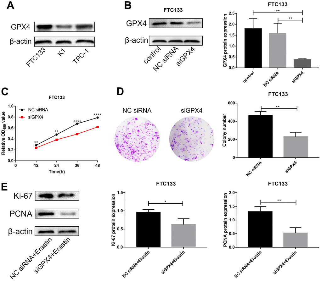 We first detected protein expression of GPX4 in three thyroid cancer cell lines (FTC133, K1 and TPC-1), with FTC133 cells exhibiting higher GPX4 protein expression than the other cell lines (Figure 5A). Therefore, we selected FTC133 cells to conduct subsequent functional tests. First, siRNA targeting GPX4 was transfected into FTC133 cells, and western blotting was applied to examine the efficiency of knockdown (Figure 5B). Western blot analysis demonstrated a significant reduction in GPX4 expression after transfection with siGPX4. CCK-8 assays were used to assess cellular viability to investigate the effect of GPX4 on the proliferation of thyroid cancer cells, and the results showed that GPX4 knockdown markedly decreased FTC133 cell viability (Figure 5C). Similarly, colony formation experiments demonstrated that inhibition of GPX4 suppresses the proliferation of FTC133 cells (Figure 5D). Erastin (M2679, Sigma, St Louis, USA), a classic ferroptosis inducer, can activate the ferroptosis signaling pathway in cells [15]. Thus, to further study the specific mechanism responsible for inhibiting proliferation, expression of proliferation markers (Ki-67 and PCNA) was evaluated in FTC133 cells transfected with NC siRNA/siGPX4 after treatment with erastin. The results verified that GPX4 knockdown obviously inhibited protein expression of Ki-67 and PCNA (Figure 5E), as well as proliferation in thyroid cancer cells.