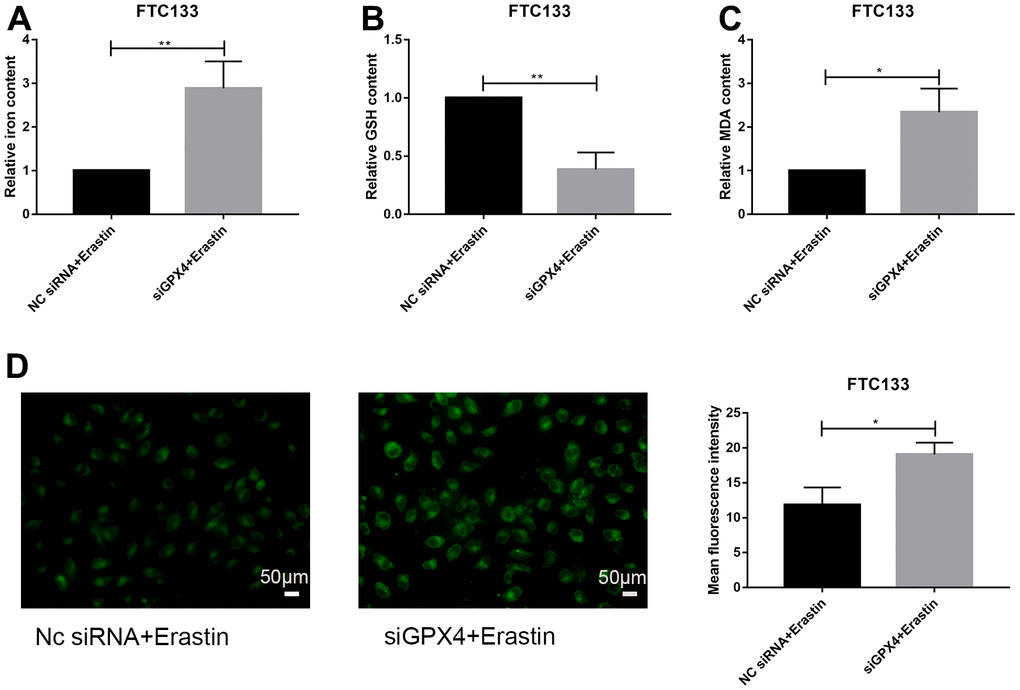 We further investigated the regulatory effect of GPX4 knockdown on ferroptosis under erastin treatment. Indicators related to ferroptosis were examined, including iron content, GSH, MDA and lipid ROS assays. The results showed that knockdown of GPX4 increased the iron content of FTC133 cells treated with erastin (Figure 6A); the MDA content was also markedly increased after erastin treatment (Figure 6C). However, the GSH content was significantly decreased (Figure 6B). Finally, lipid ROS experiments showed that GPX4 knockdown induced lipid peroxidation in FTC133 cells (Figure 6D). Thus, we infer that knockdown of GPX4 obviously activates the ferroptosis signaling pathway in FTC133 cells.