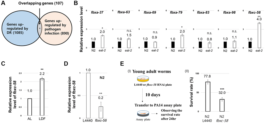 To uncover the innate immune signal that mediates the DR effect, we hypothesized that candidate genes would be upregulated in response to both DR and pathogen infection. Based on this assumption, we analyzed previously reported DEG data for DR [12] and the pathogen [Pseudomonas aeruginosa (PA14)]-infected condition [20]. As shown in Figure 1A, we found that 1,085 and 890 genes were upregulated by DR and PA14 infection, respectively. Among these genes, we investigated those (107 genes) that were simultaneously upregulated under both conditions (Figure 1A, Supplementary Table 1) and found that F-box genes (7.5%) fit this criterion (Supplementary Table 1). Among the F-box genes, we found that fbxc-58 was most highly expressed (~4-fold) under DR conditions (induced by eat-2 mutation) (Figure 1B). Furthermore, fbxc-58 expression also increased 2.2-fold under low density of food (LDF) feeding conditions [4] compared with that under ad libitum (AL) conditions (Figure 1C), implying that fbxc-58 was upregulated in response to DR.
