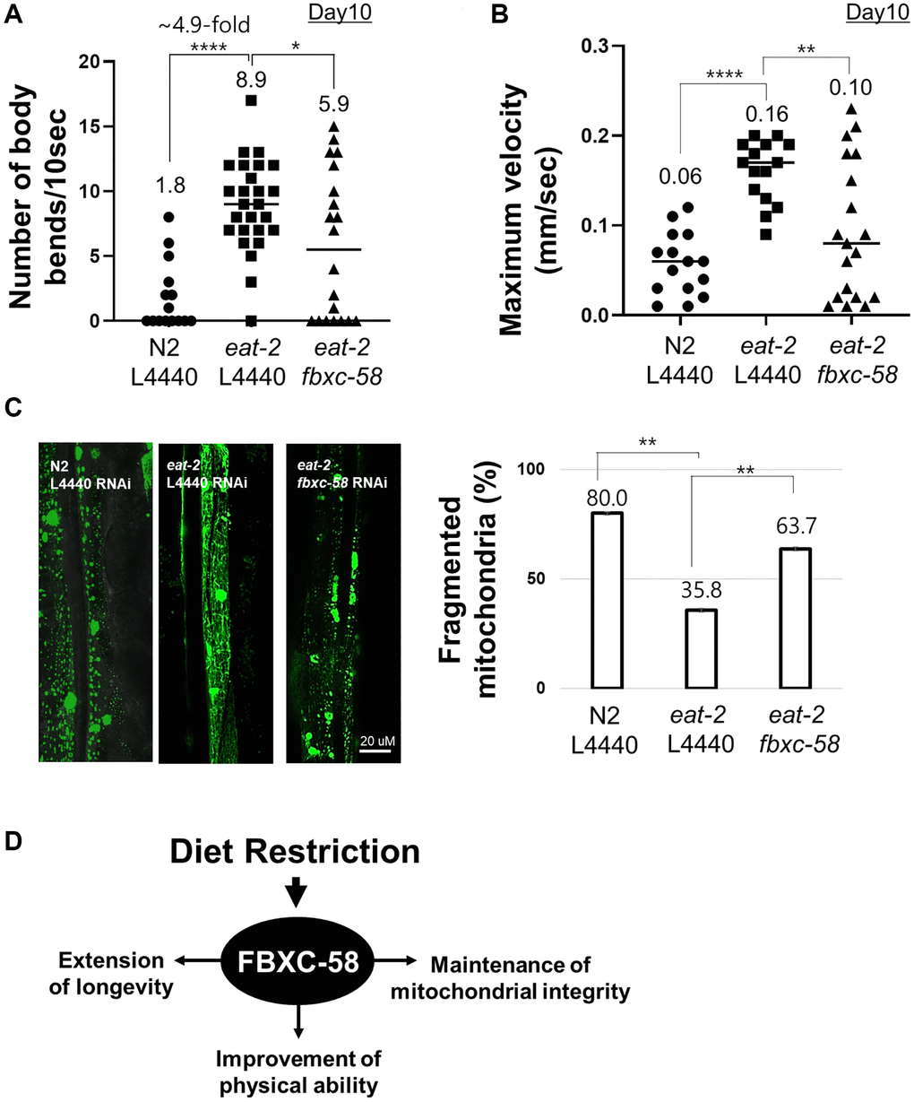 Further, in C. elegans, maximum body movement velocity (MV) is a potent indicator of their health condition and muscle activity [21]. As shown in Figure 3B and Supplementary Figure 3A, the aged eat-2(ad1116) mutant strain exhibited higher MV than that of the aged N2 strain, although MV in the young N2 strain was slightly higher than that of young eat-2(ad1116) mutants (Supplementary Figure 3B). However, the MV of aged eat-2(ad1116) mutants significantly decreased when fbxc-58 was abrogated (P < 0.01) (Figure 3B, Supplementary Figure 3A). This data signifies the essentiality of fbxc-58 in improving the physical health of aged C. elegans through DR. Note that there was no statistical difference in MVs by fbxc-58 RNAi in aged N2 strains (Supplementary Figure 4).