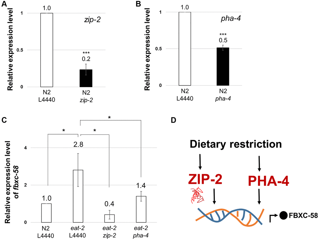 To understand the underlying molecular mechanism of fbxc-58 in DR in detail, we examined the correlation between fbxc-58 and zip-2 since ZIP-2 is a well-known immune response effector in C. elegans [24]. Additionally, ZIP-2 is a transcription factor that regulates aging process [25] and the extent of longevity under various DR conditions, including dietary deprivation, diluted peptone, or diluted OP50 without peptone [4]. Note that we confirmed that zip-2 or pha-4 significantly reduced under zip-2 RNAi or pha-4 RNAi conditions, respectively (Figure 4A, 4B). As shown in Figure 4C, we found that fbxc-58 expression was significantly diminished by silencing zip-2 in eat-2(ad1116) mutants compared with that in the L4440 RNAi control. This data implies that fbxc-58 is upregulated by zip-2 under DR conditions. Additionally, we confirmed that C10C5.2 (sequence name of fbxc-58) is among the genes that are downregulated by zip-2 RNAi in previously reported differentially expressed gene (DEG) data [24], indicating that fbxc-58 is a downstream target gene of ZIP-2.