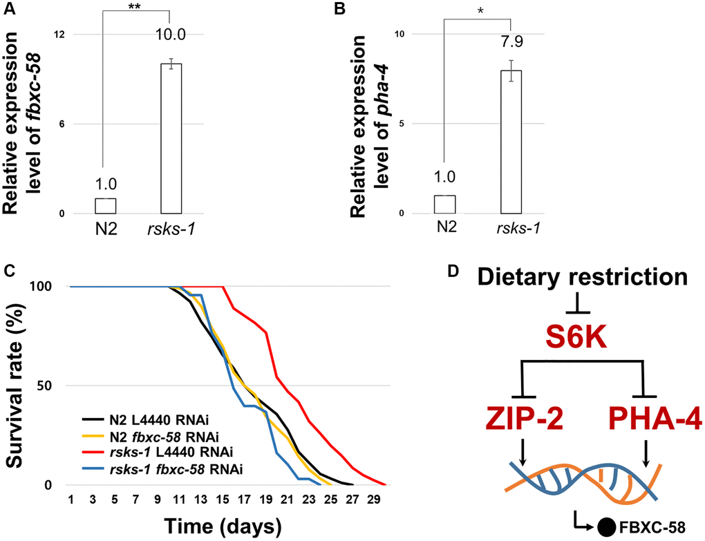PHA-4 is the forkhead box transcription factor that mediates the lifespan extension induced by eat-2 mutation [26]. We found that fbxc-58 expression was decreased in pha-4 RNAi eat-2(ad1116) mutants compared with that in the L4440 RNAi eat-2(ad1116) mutant strains (Figure 4C). This data implies that fbxc-58 is a downstream target gene of PHA-4. Thus, all of these data corroborate the fact that fbxc-58 is indeed a downstream effector of DR (Figure 4D).