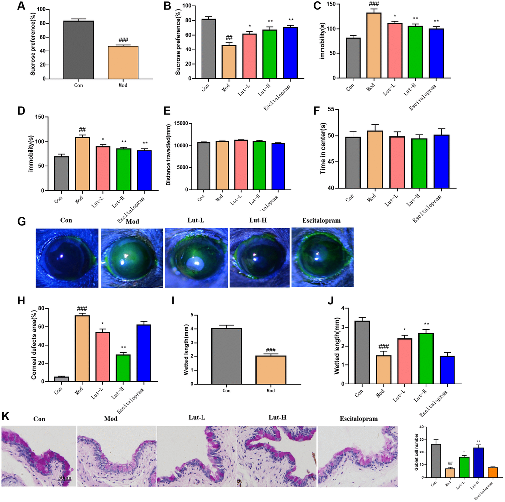 To explore the effects of luteolin on depression-related dry eye disorder, we made some modifications to the CUMS procedure described earlier [51]. We eliminated the use of moist litter and forced swimming in mice, retaining stressors such as food and water deprivation, constant light, 45° cage tilt, restraint, flashing lights, tail pinching, and space crowding. Meanwhile, a fan was placed above the mouse cage, blowing at a moderate speed (about 600 r/min) for 12 h a day to keep the humidity in the cage below 30–35%. After 4 weeks of stress, luteolin (5 mg/kg), luteolin (10 mg/kg) and escitalopram (10 mg/kg) were administered by gavage once daily for three weeks. Meanwhile, the control group and the CUMS group were gavaged with normal saline. Mice were then sacrificed after assessing behavioral testing and dry eye testing. In Experiment 2, EX-527 (10 mg/kg) was administered intravenously for two consecutive weeks starting at the fifth week.