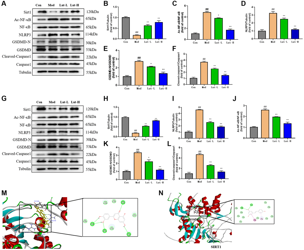 The activity of Sirt1 in mouse hippocampal dentate gyrus was decreased after chronic stress. Additionally, inhibition of hippocampal Sirt1 function in mice on the basis of genetics and pharmacology can lead to the increase of depression-like behaviors [26]. Due to the reversal of depressive behaviors and dry eye symptoms in mice, we speculated that luteolin might act on Sirt1 protein to treat depression-related dry eye disorder in mice. To clarify the therapeutic effect of luteolin on CUMS-induced depression, we used Western Blot to detect the protein expression levels of Sirt1, NLRP3, Cleaved-caspase1 and Caspase1 in the mouse hippocampus (Figure 3A). The results showed that compared with the control group, the level of Sirt1 protein in the hippocampus of CUMS-induced mice was significantly decreased (P < 0.01). Both the luteolin (5 mg/kg) treatment group (p < 0.05) and the luteolin (10 mg/kg) (P < 0.01) treatment group significantly increased Sirt1 protein levels (Figure 3B). The protein expression levels of Ac-NF-κB, NF-κB, NLRP3, GSDMD-N, GSDMD, Cleaved-Caspase1 and Caspase1 were significantly up-regulated after CUMS stimulation (p < 0.01). The treatment with luteolin (5 mg/kg) and luteolin (10 mg/kg) could significantly reverse the down-regulations of protein expression of Ac-NF-κB, GSDMD-N and GSDMD (p < 0.01). In addition, NLRP3, Cleaved-Caspase1 and Caspase1 protein expression levels were remarkably down-regulated after luteolin (5 mg/kg) (p < 0.05) and luteolin (10 mg/kg) (p < 0.01) treatments (Figure 3C–3F). Similarly, we also detected the above proteins in mouse cornea tissue, showing the same change trend as in mouse hippocampus (Figure 3G–3L).