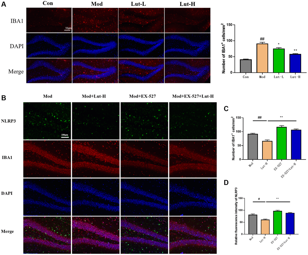 In addition, the Sirt1 protein inhibitor EX-527 was further used to explore the role of Sirt1 in CUMS-exposed mice. The effect of luteolin (10 mg/kg) on microglia activation was undoubtedly abolished by EX-527, which was positive for Iba1. The number of cells increased, suggesting that luteolin reduces microglia activation by activating cells through the Sirt1 protein (Figure 4B, 4C).